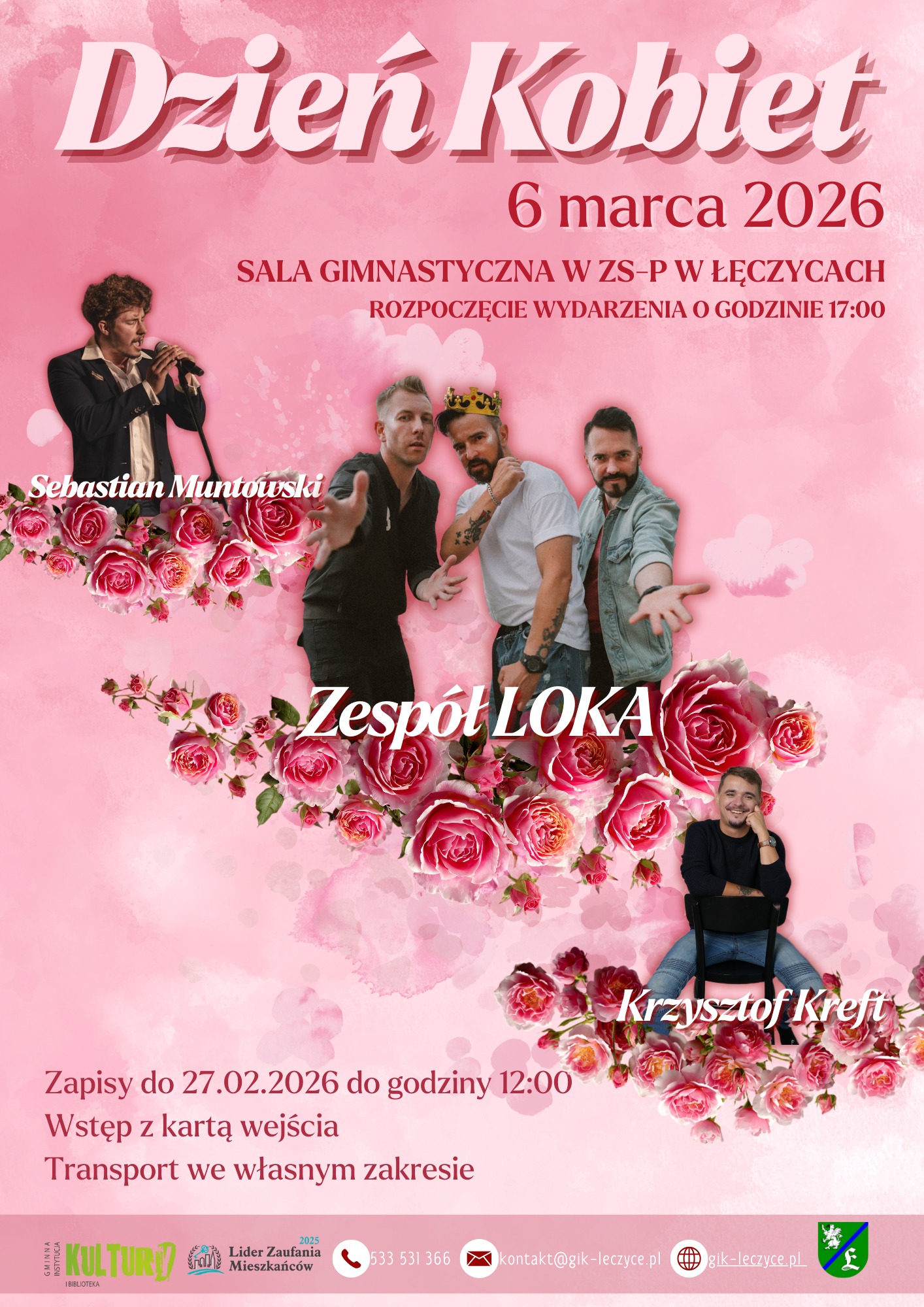 Z okazji Dnia Kobiet zapraszamy panie z terenu Gminy Łęczyce na wydarzenie, które odbędzie się 6 marca 2026 r. w sali gimnastycznej ZS-P w Łęczycach. Przed nami spotkanie z artystami reprezentującymi różne muzyczne wrażliwości i style: