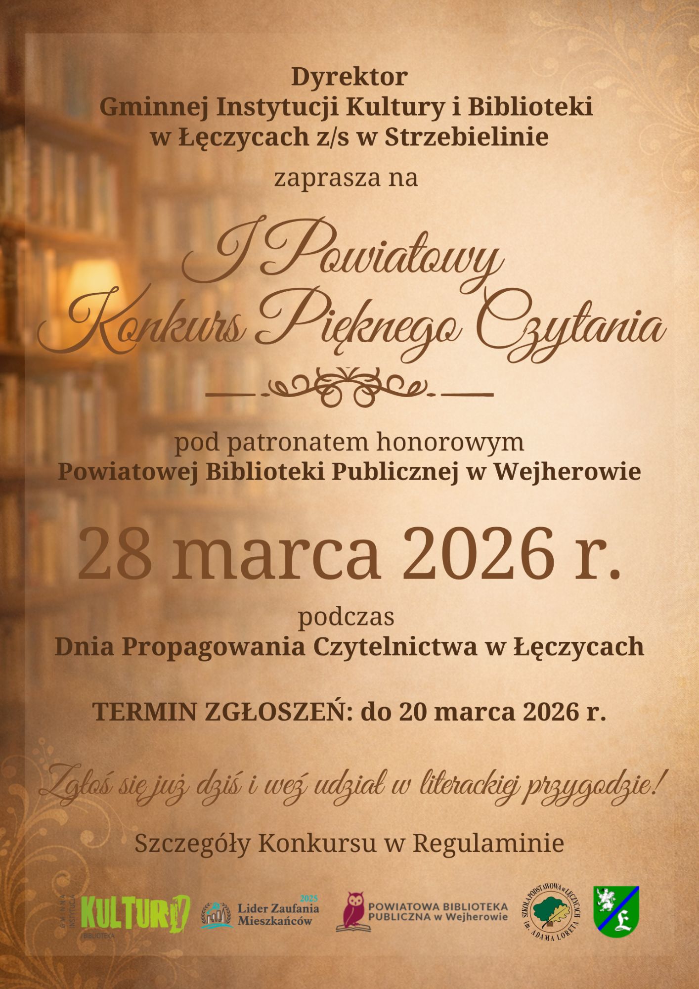Dyrektor Gminnej Instytucji Kultury i Biblioteki w 艁臋czycach z/s w Strzebielinie zaprasza do udzia艂u w Powiatowym Konkursie Pi臋knego Czytania, organizowanym pod patronatem honorowym Powiatowej Biblioteki Publicznej w Wejherowie.